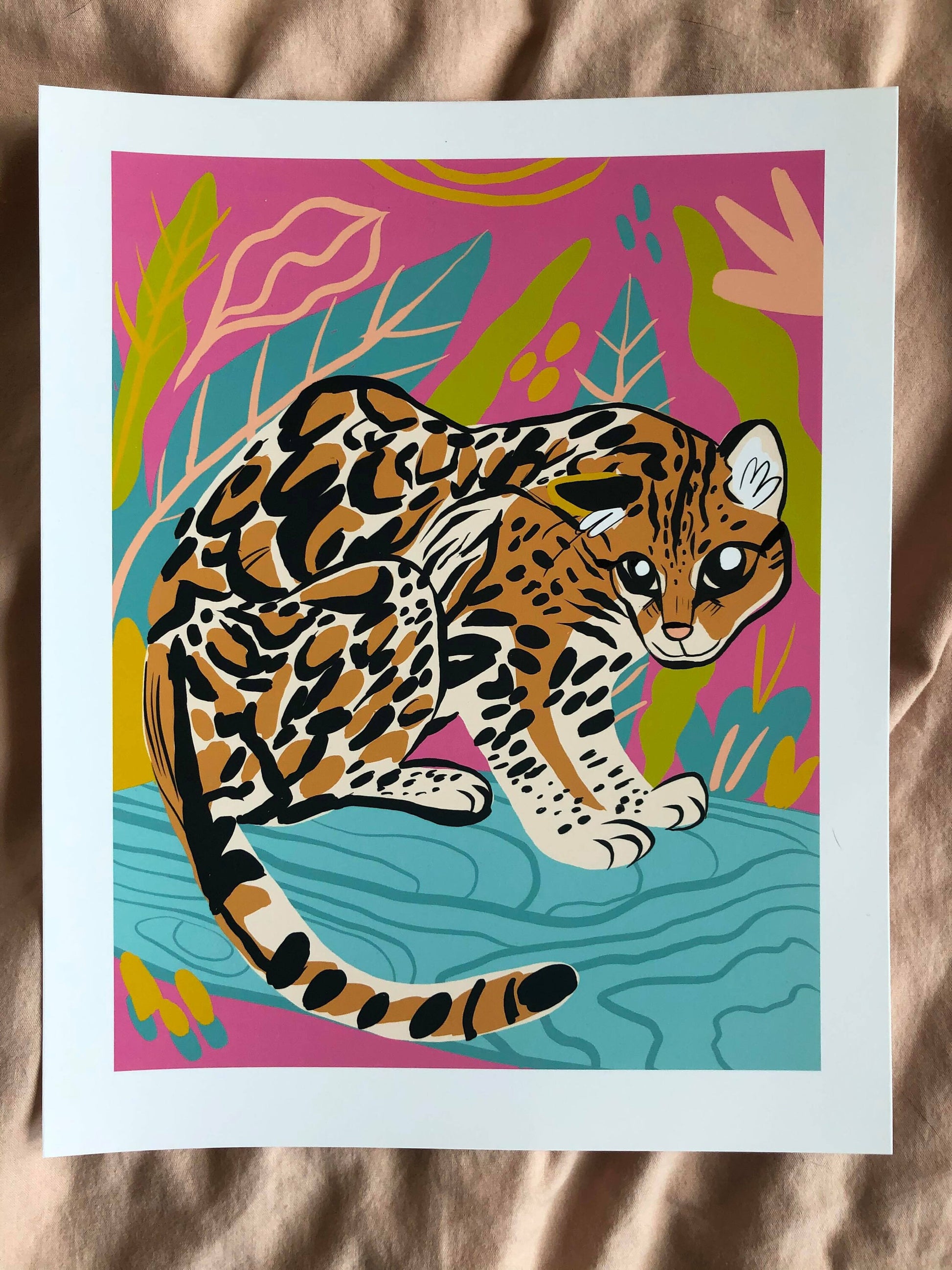 I've been working on a series of larger cats for my print series called Big Cat Diaries. So far featuring, saber tooth cat, ocelot, serval, lynx and snow leopard! these cats are sure to give your walls a huge pop of color!