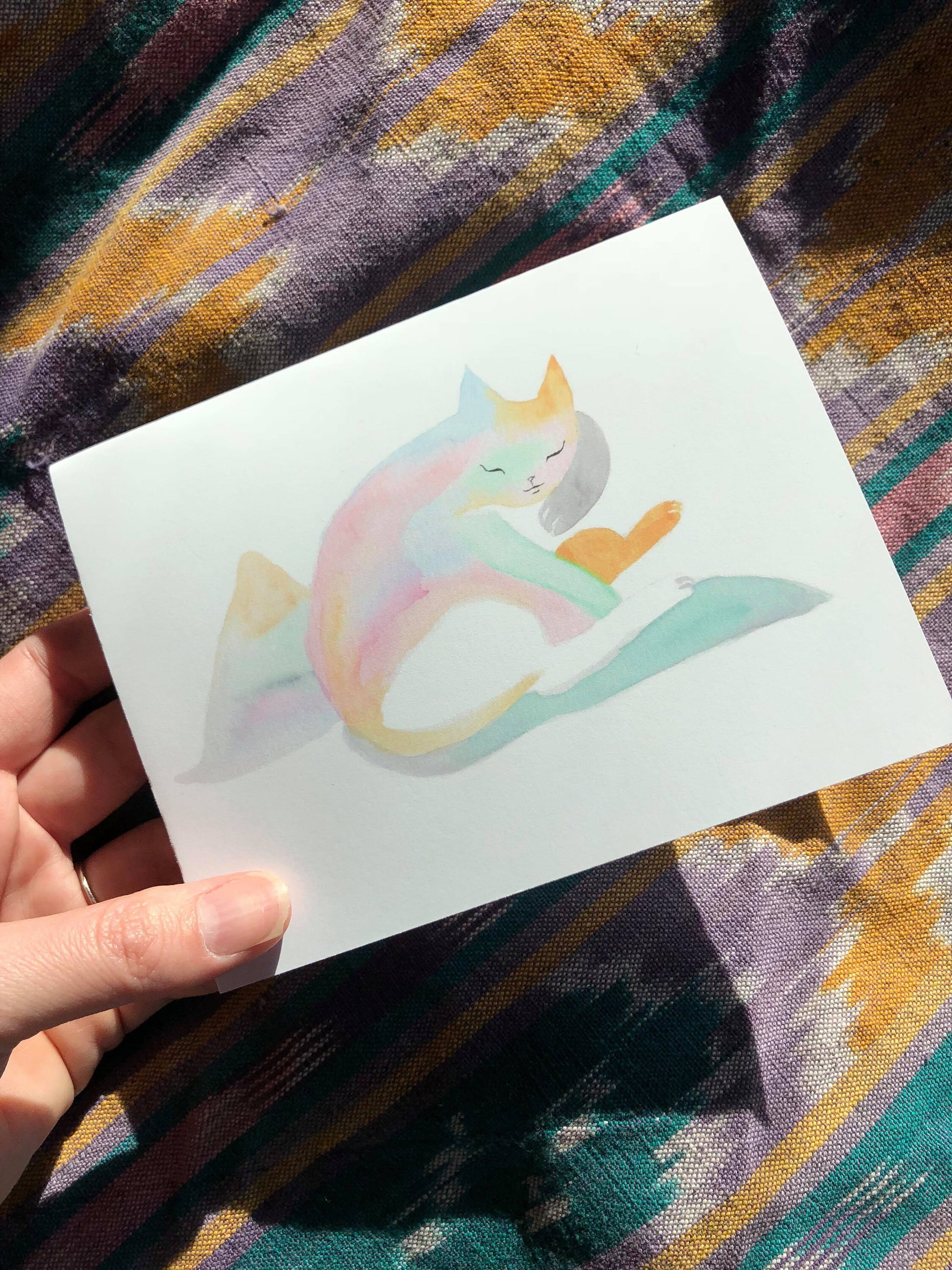 This cat is as relaxed as the mountain behind them. Keep on sleeping crystal cat. Crystals, minerals and cats are some of my favorite things. I wanted to create a series of cards that were inspired by cross sections of gems and minerals, paired with my favorite animal. Cats!