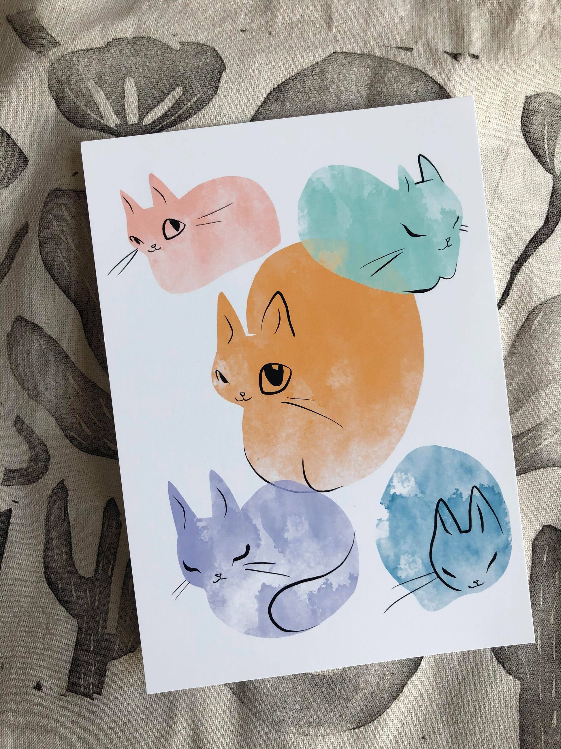 subject: a cutie rainbow cat and her two cloud sisters! and easter egg cats mini print!