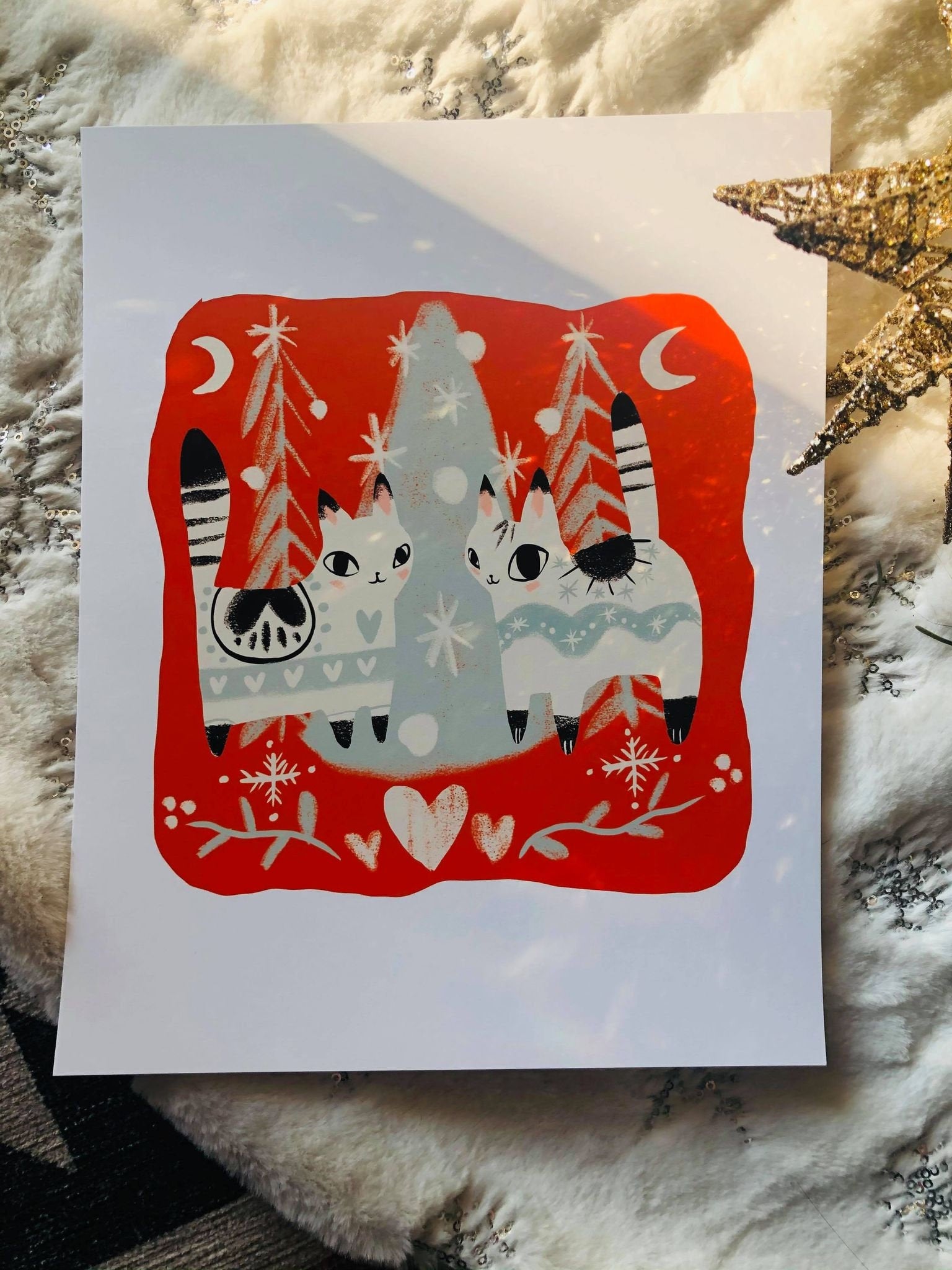 -Nordic cat twins. Two little Nordic cats hanging out on a red background with trees.