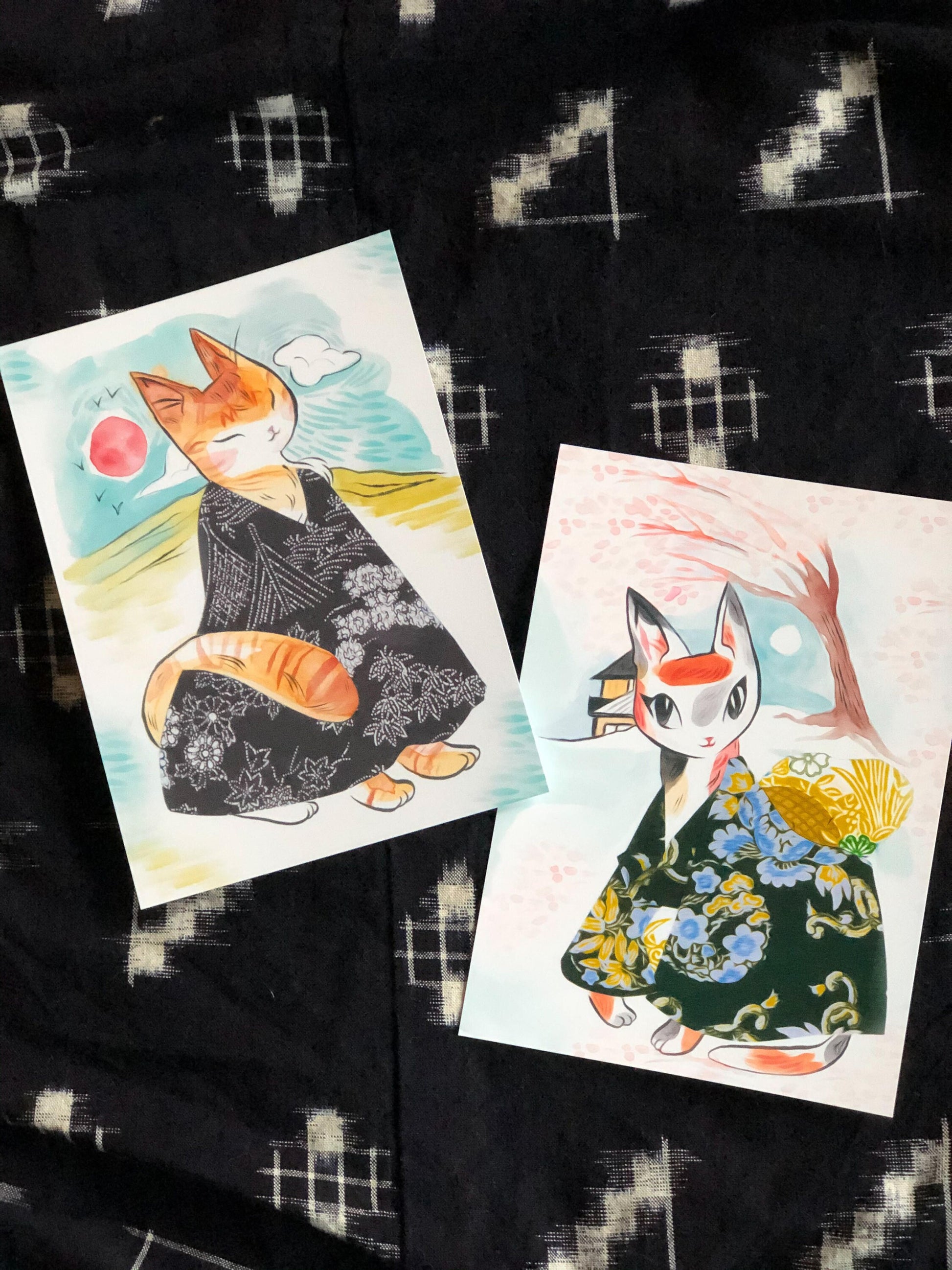 I had some oragami paper laying around and really wanted to create some prints of cats wearing kimonos. These started out as hand cut pieces over linework and watercolor cats. My great grandparents were from Japan. I often find myself wanting to create things that symbolize that side of my background.